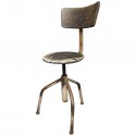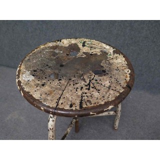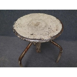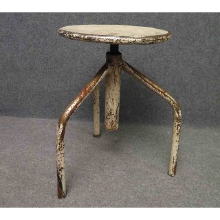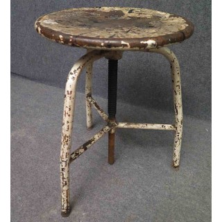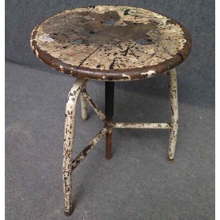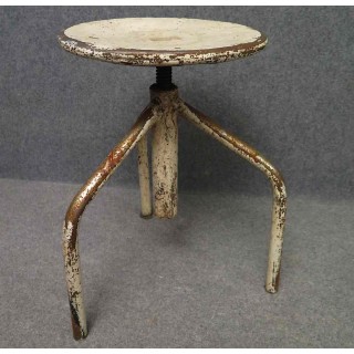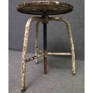 Tutto in metallo laccato bianco consumato dal tempo. Il sedile è girevole e può essere alzato e abbassato a seconda delle esigenze. Ha tre piedi piegati che si uniscono nel mezzo; qui sono saldati ad un tubo che contiene la grossa vite che fa alzare e abbassare lo sgabello. La grossa vite è ancorata al sedile. Le gambe nella parte inferiore sono unite da tre piccoli poggiapiedi uniti al centro. La seduta è formata da una piastra metallica rotonda. Il metallo solido presenta segni duri del tempo e dell'uso industriale. Misure Cm ( 35 x 35, H 45/65 ). Inches ( 14 x 14, H 25/17 ).