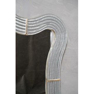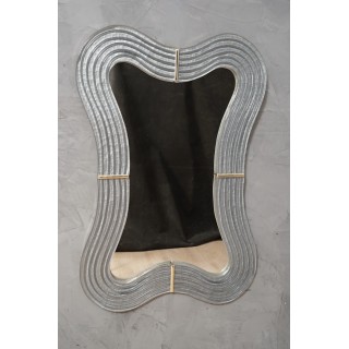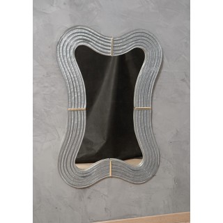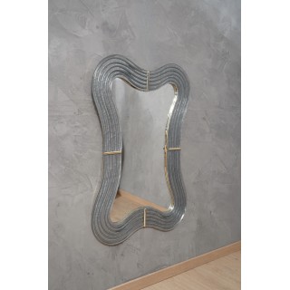 Lo specchio è composto da una cornice perimetrale in vetro di Murano di colore verde acqua, che forma delle curve nel suo disegno, intervallate da modanature in ottone. Anche il vetro non è liscio ma forma belle ondulazioni orizzontali lungo il perimetro. Interessante il suo design, che dona movimento e leggerezza alla cornice. Misure Cm ( 120 x 80 ). Inches ( 47 x 31 ).
