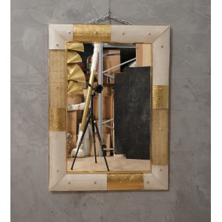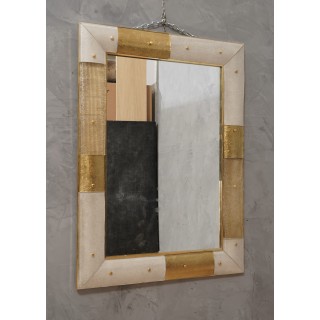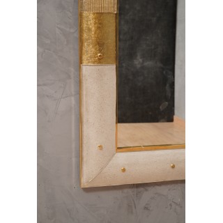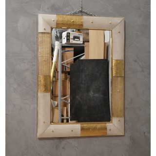 La struttura dello specchio da parete è in legno, dove è alloggiato il vetro di Murano oro e bianco. La cornice dello specchio è composta da una serie di scandole, posizionate una accanto all'altra. Le tegole sono realizzate in vetro di Murano colore oro e bianco, e il retro delle tegole poggia sul piano della cornice, per esaltare il colore oro e bianco. Lungo il perimetro delle tegole, sia internamente che esternamente, sono state poste delle modanature in ottone. Può essere montato sia orizzontalmente che verticalmente. Misure ( 122 x 89 ) Inches ( 48 x 35 ).