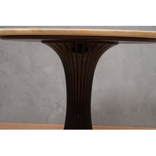 Il piano del tavolo è infatti in marmo; un marmo pregiato e di naturale bellezza, sapientemente scelto per esaltare la particolare struttura della gamba centrale in legno laccato; gamba elaborata e studiata nella sua struttura per dare la sensazione di un fiore che sboccia, o meglio che sia sbocciato con un marmo molto pregiato, che rappresenta i petali di un fiore. Elegante e raffinata, donerà un'aria ancora più sofisticata a qualsiasi spazio interno della vostra casa. La base sotto gamba è sempre in marmo, abbinata al piano.