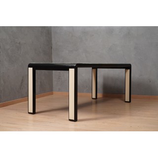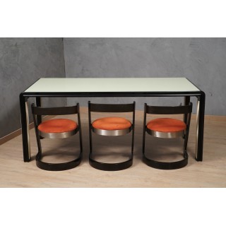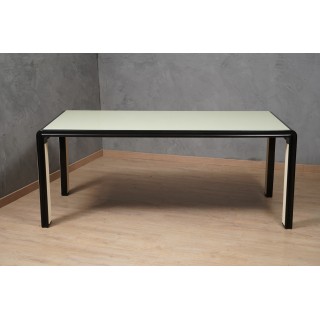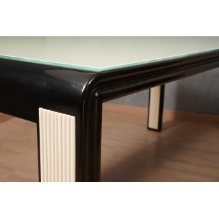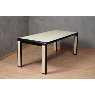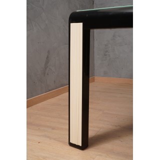 Il tavolo è di forma rettangolare, ha una struttura in legno di faggio laccato nero e presenta quattro bellissime gambe agli angoli del rettangolo. Il piano è in vetro laccato color panna ed è leggermente incassato nel legno; piano di bello spessore e ben molato lungo i bordi.