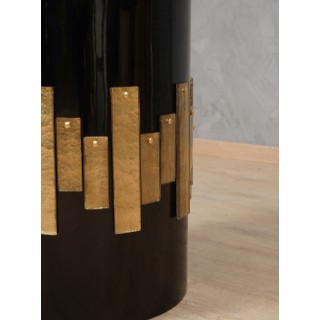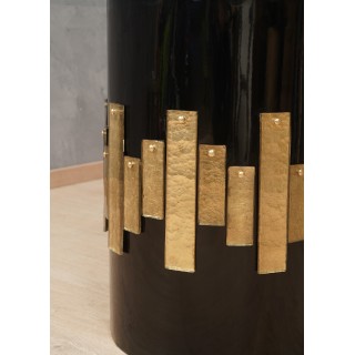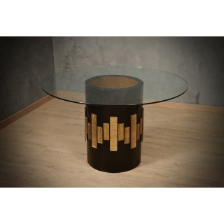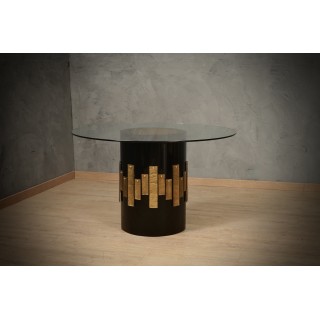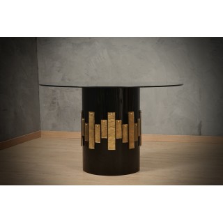 Il tavolo è composto da un ampio piano in vetro trasparente di generoso spessore, e da una base rotonda in legno laccata a gommalacca nera; Lungo il perimetro della base sono applicate lastre in vetro di Murano color oro. Il tavolo è divisibile in due pezzi: la parte in vetro e la parte gamba. Misure ( diametro 120, H 74 ). Inches ( diameter 47, H 29 ).