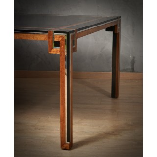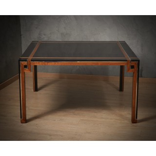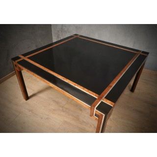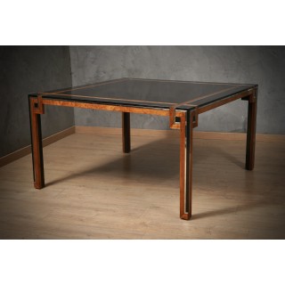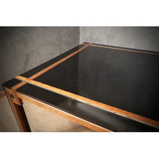 The table has a square shape, and a wooden core. The structure was plated with poplar root, chromed metal and black masonite. Its design is very complex, the central top has a large slab of black masonite, surrounded by strips of poplar and chromed metal. The legs are very fine and elegant, and are equally veneered like the top. With its unique characteristics and meticulous attention to detail, this table is a testimony to the innovative vision and artistic sensitivity of Romeo Rega, an Italian designer of the second half of the last century. The condition of the item is consistent with age and use, but has only a few superficial scratches and nicks. Every item the warehouse HannauRoma offers is checked by our team of craftsmen. We guarantee a very high-quality standard, ask our design specialists for detailed information. Misure ( 130 x 130, H 72 ) Inches ( 51 x 51, H 28 ).