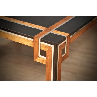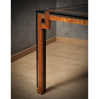Il tavolo ha una forma quadrata e un'anima in legno. La struttura è stata placcata con radica di pioppo, metallo cromato e masonite nera. Il suo disegno è molto complesso, il piano centrale presenta una grande lastra di masonite nera centrale, contornata da listelli di pioppo e metallo cromato. Le gambe sono molto fini ed eleganti, e sono ricoperte come il piano. Con le sue caratteristiche uniche e la meticolosa attenzione ai dettagli, questo tavolo è testimonianza della visione innovativa e della sensibilità artistica di Romeo Rega, designer italiano della seconda metà del secolo scorso. Misure ( 130 x 130, H 72 ) Inches ( 51 x 51, H 28 ).