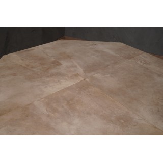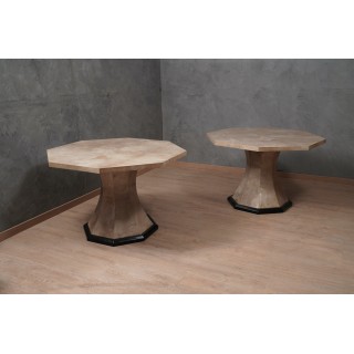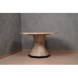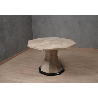 Il tavolo ha un piano ottagonale, completamente rivestito in pelle di pergamena; Ben lucidato e rifinito, il piano risplende delle venature del cuoio, dal colore molto caldo e accogliente alla vista, è perfetto come tavolo da centro ma non disdegna come tavolo da pranzo. La sua gamba, centrale come si vede, è anch'essa di forma ottagonale e interamente rivestita di pelle di pergamena; solo nella parte finale presenta un bordo lungo tutto il perimetro laccato nero. Misure ( diametro 120, H 79 ). Inches ( diameter 43, H 31 ).