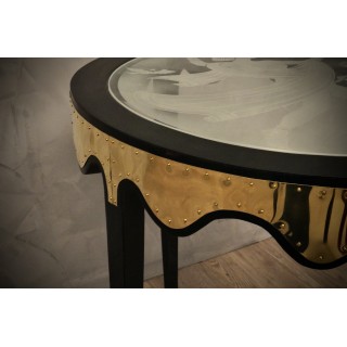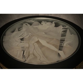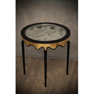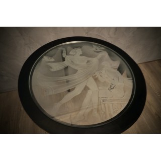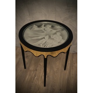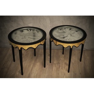 A pair of lovely round side tables all in beech wood polished with black shellac. The top is composed of a frame, in which an engraved glass is inserted. While the band of the table in addition to being polished with black shellac, is edged with a thin brass sheet; this is then nailed with small brass nails. The glass depicts a nude female figure singing and dancing before a figure of a youth seated on a bench, seemingly lost in his melody. The legs are four, very tapered and elegant. Cm ( diametro 60, H 60 ). Inches ( diameter 23, H 23).