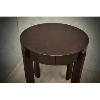 All veneered in walnut wood stained in dark mahogany. Round in shape, the side table is composed of a top bordered by a large side band, which houses the four legs. The legs are linear and straight with a rectangular section; these give a momentum and a particular elegance to the table. Misure Cm ( Diametro 60 x H 70 ). Inches ( Diameter 24 x H 27 ).