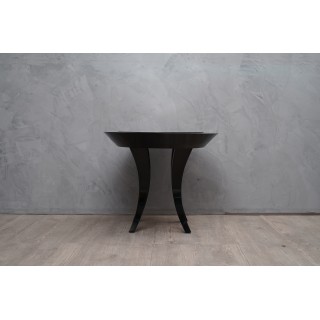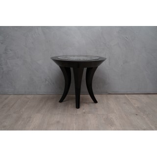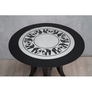 The coffee table has a massive wooden frame polished with black shellac. The side table are formed by a large frame for the top, supported by four legs with a very particular shape. Above it was placed a mirror previously engraved and then colored in black. In the drawing stylized elephants have been represented, to form a sort of concentric frame. Misure Cm ( Diametro 80 x H 65 ). Inches ( Diameter 31 x H 25 ).