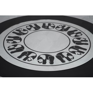 Il tavolino ha una massiccia struttura in legno lucidato con gommalacca nera. I tavolini sono formati da un'ampia cornice per il piano, sorretta da quattro gambe dalla forma molto particolare. Sopra di esso è stato posto uno specchio precedentemente inciso e poi colorato di nero. Nel disegno sono stati rappresentati elefanti stilizzati, a formare una sorta di cornice concentrica. Misure Cm ( Diametro 80 x H 65 ). Inches ( Diameter 31 x H 25 ).
